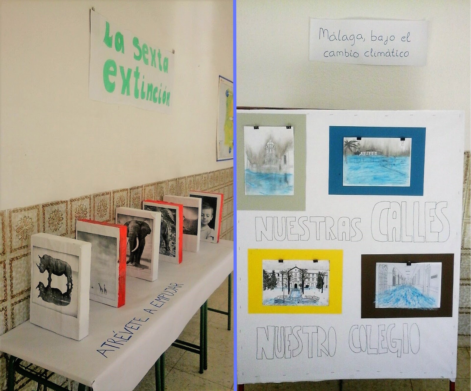 Exposición sobre el cambio climático. Con obras de alumnado de 4ºESO de Plástica y de Cultura Científica y el asesoramiento de Lucía Vázquez (del área educativa del museo Picasso) la exposición consta de tres secciones en las que se plantea qué es el cambio climático, cómo será nuestro futuro si no se toman medidas y cómo ser cada uno de nosotros/as el cambio que la Tierra necesita para que siga siendo nuestra casa. Además se ha elaborado una guía didáctica para que el profesorado de todo el colegio pueda visitar esta exposición con su alumnado.